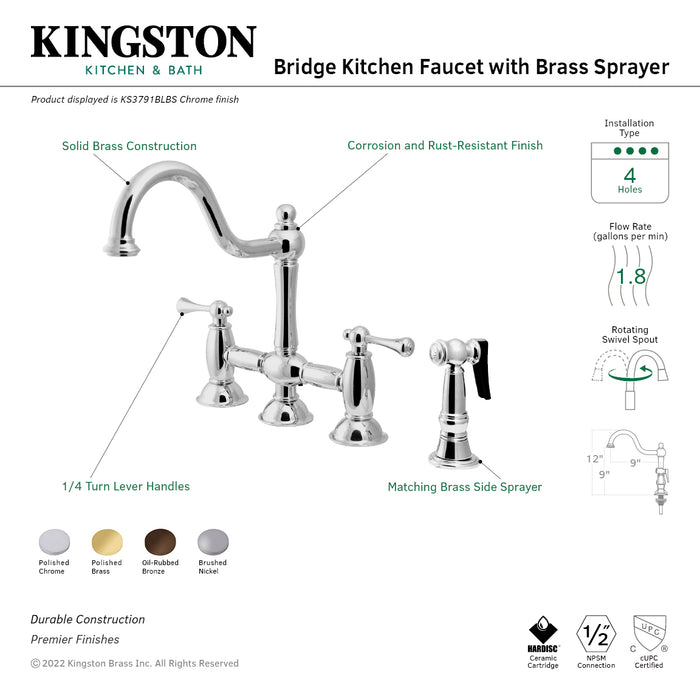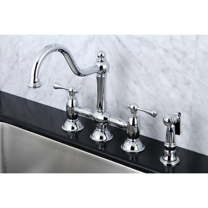 Kingston Heirloom KS3791BLBS - Restoration Two-Handle 4-Hole Deck Mount Bridge Kitchen Faucet with Brass Sprayer, Polished Chrome