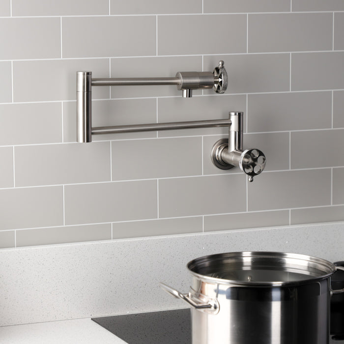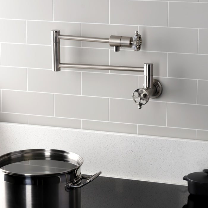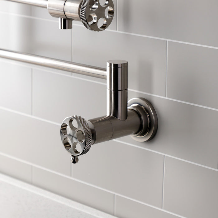 Kingston Sona KS4108RKX - Webb Two-Handle 1-Hole Wall Mount Pot Filler Faucet with Knurled Handle, Brushed Nickel