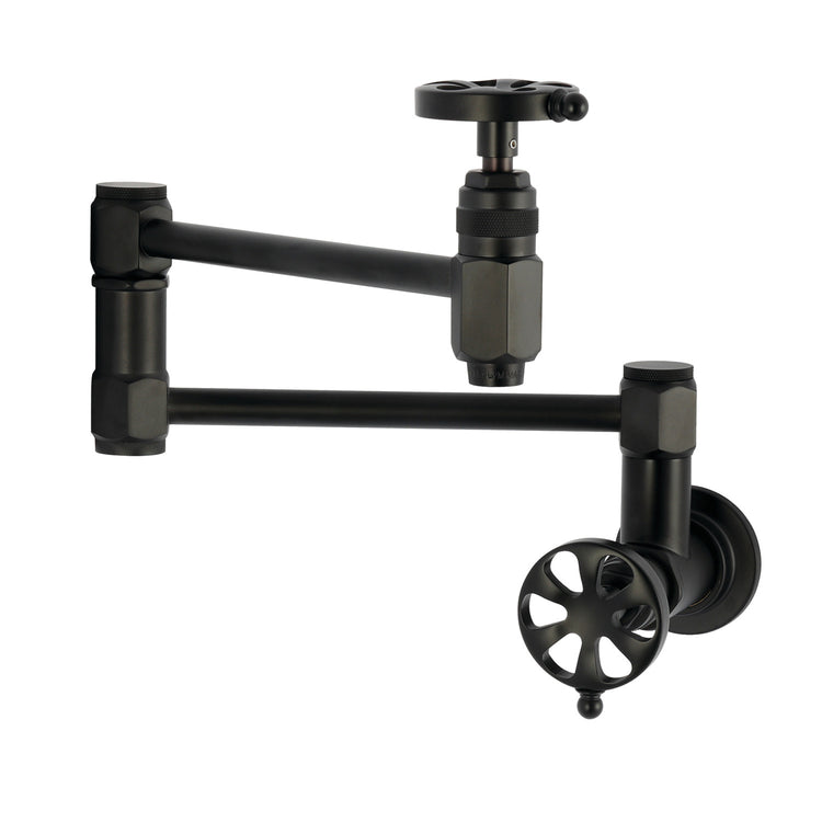 Transform your kitchen with the stunning pot filler from the Belknap Collection® by Kingston. Featuring stylish industrial inspired wheel handles and faceted handle bases, this faucet not only enhances your decor but also saves you the hassle of carrying heavy pots of water to the stove. Equipped with two ceramic cartridge valves for added safety.