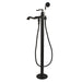 Distinguished for their stately configuration and artsy architecture, freestanding tub faucets are the perfect fixture for any contemporary home to both complement a freestanding tub and act as a beautiful ornamental piece in your bathroom. As the perfect accompaniment to your tub, the Royale Freestanding Roman tub filler With Hand Shower will surely complete your refined bathroom decorum with the help of its premium, glistening matte black finish and hand shower. The solid brass construction also makes for a heavy, quality made product.