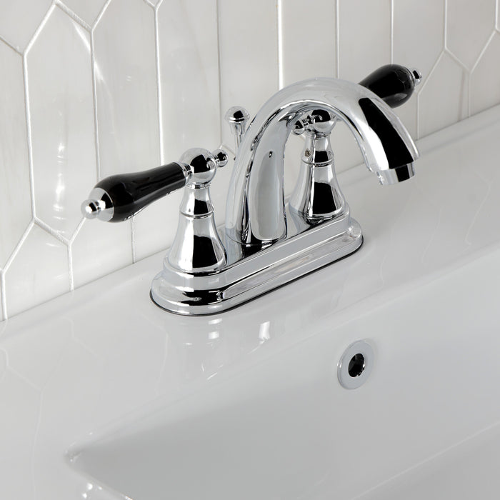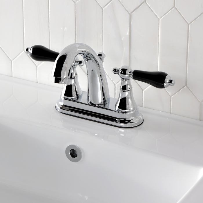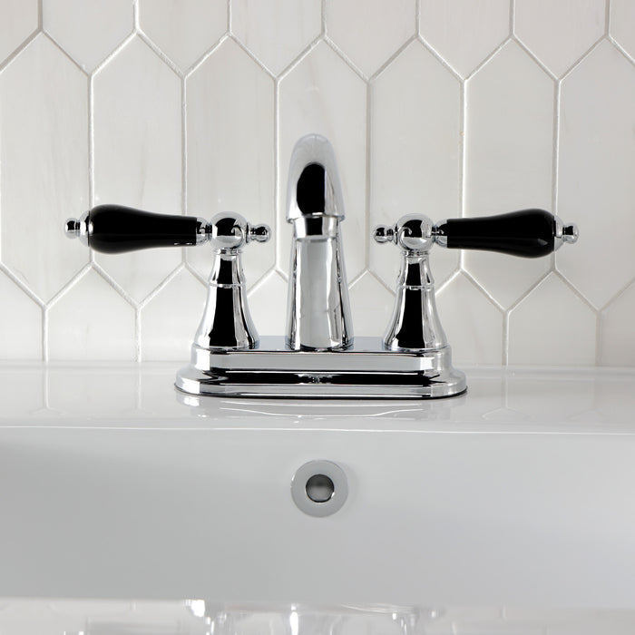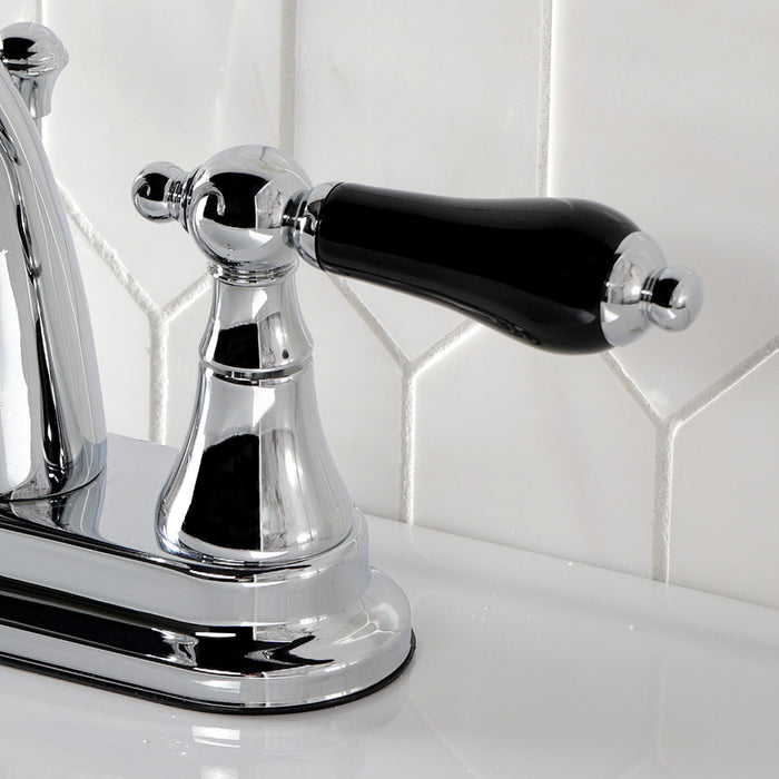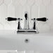 Crafted in commendations to English nobility, the exemplary design of this faucet manifests regality and elegance with its black porcelain handles. Centerset bathroom faucets are ideal for smaller bathrooms and feature an easy 3-hole installation. The Duchess 4-inch centerset bathroom faucet with brass pop-up and its featured sturdy brass construction and premium polished chrome finish are guaranteed to glamorize your home's traditional ensemble for years to come. Glamorize your home today with the traditional elegance of this faucet. A matching finish drain is also included.