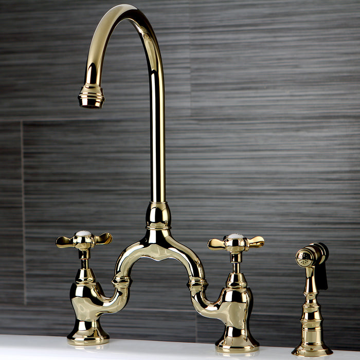 Kingston Heirloom KS7792BEXBS - Essex Two-Handle 3-Hole Deck Mount Bridge Kitchen Faucet with Brass Sprayer, Polished Brass