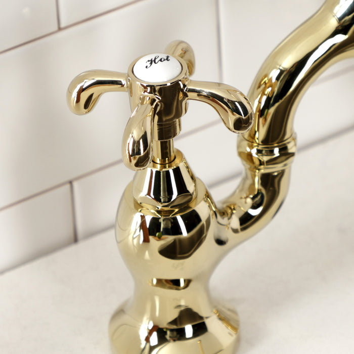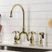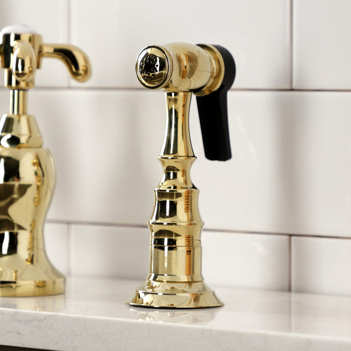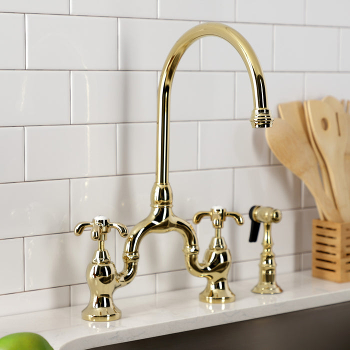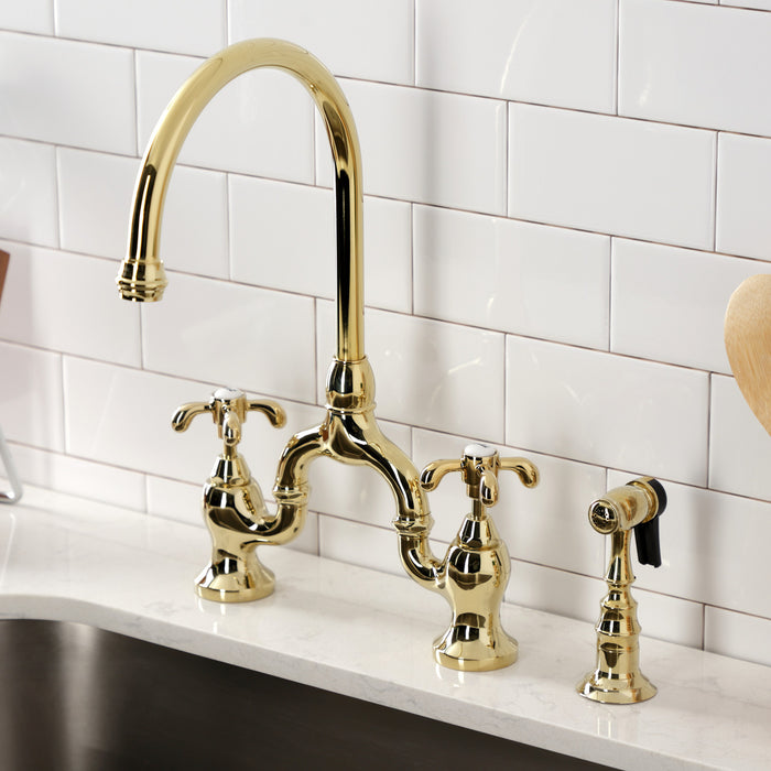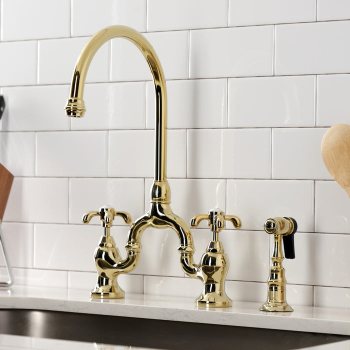 Kingston Heirloom KS7792TXBS - French Country Two-Handle 3-Hole Deck Mount Bridge Kitchen Faucet with Brass Sprayer, Polished Brass