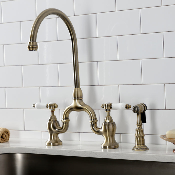 The graceful elegance of timeless design is beautifully merged between British flair and Victorian delicacy within this faucet's white porcelain levers. Whether you are striving for a Victorian-inspired kitchen or a vibrant 1950s-themed space, the unique bridge design is a highly favored option amongst those doing period-style kitchens. Because of its added architectural elements and detailing, the antique brass finish will pop against your surrounding kitchen decor. Allow the brass construction, side sprayer, and swivel abilities to provide a sturdy and reliant fixture, great for use with any sink.
