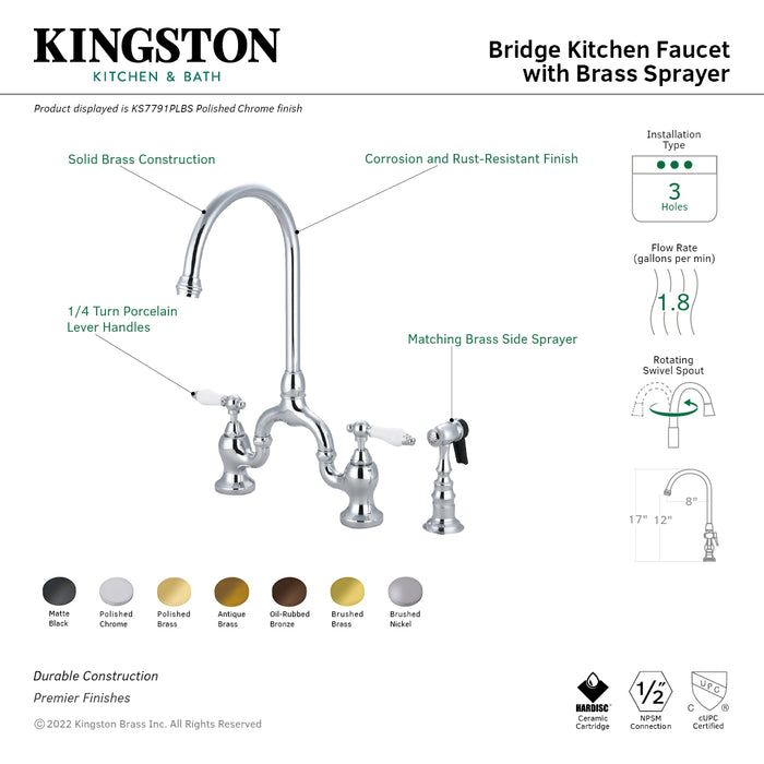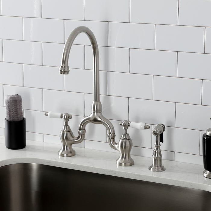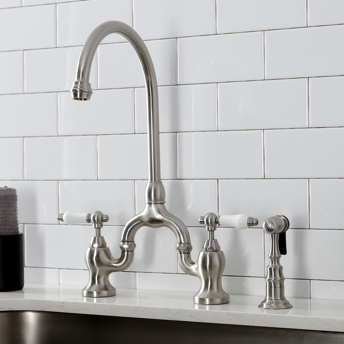 Kingston Heirloom KS7798PLBS - English Country Two-Handle 3-Hole Deck Mount Bridge Kitchen Faucet with Brass Sprayer, Brushed Nickel