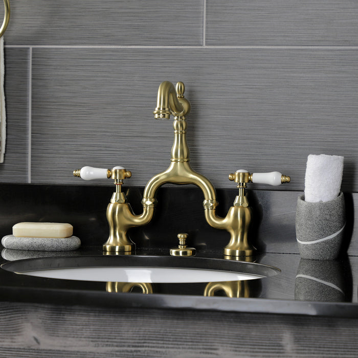 The graceful elegance of timeless design is beautifully merged between British flair and Victorian delicacy within this faucet's white porcelain levers. Elegantly designed, the exquisite arch connecting the spout to the handles provides an added aesthetic appeal to make for more of a statement piece. Additionally, the 8-1/16 inch of spout clearance make for a very easy hand washing experience with plenty of room for other tasks. The Bel-Air bridge bathroom faucet and its featured sturdy brass construction and premium brushed brass finish are guaranteed to glamorize your home's traditional ensemble for years to come. Varnish your bathroom with this state-of-the-art fixture. A matching finish drain is also included.