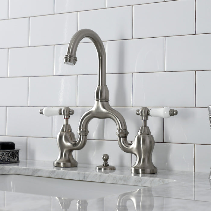 Kingston Tulare KS7998PL - English Country Two-Handle 3-Hole Deck Mount Bridge Bathroom Faucet with Brass Pop-Up, Brushed Nickel