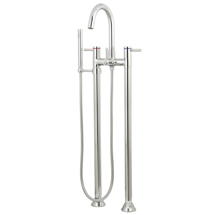 Distinguished for their stately configuration and artsy architecture, freestanding tub faucets are the perfect fixture for any contemporary home to both complement a freestanding tub and act as a beautiful ornamental piece in your bathroom. As the perfect accompaniment to your tub, the Concord Floor Mount Tub Filler with Hand Shower will surely complete your refined bathroom decorum with the help of its premium, glistening polished chrome finish and hand shower. The solid brass construction also makes for a heavy, quality made product.