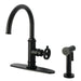 Introducing the single handle kitchen faucet with side spray from the Levante Collection by Kingston Brass. Featuring a sleek tubular gooseneck spout and a contemporary nautical-style knurled wheel handle, this faucet is designed to be the centerpiece of any modern kitchen. With a projection of over 8 inches and an 8-inch deck-to-spout clearance, it combines style with practicality, making it perfect for tackling any kitchen task. Crafted from solid brass and equipped with a ceramic cartridge, this faucet promises years of reliable performance. It can be easily installed in any 4 or 2-hole kitchen counter setup, making it a versatile addition to your home.
