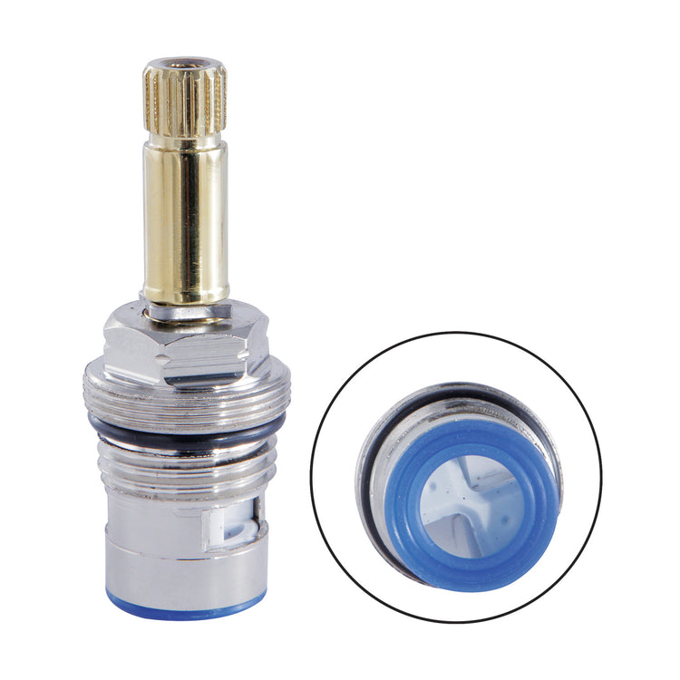 The ceramic disc cartridge is the heart of the faucet, controlling its temperature and water flow. Internally, two opposing discs made out of ceramic carbide rotate to control the flow of water. Because ceramic carbide is impervious to friction, it can last for many years before needing replacement. This cold-side stem cartridge with a 3/8" x 16 spline broach.