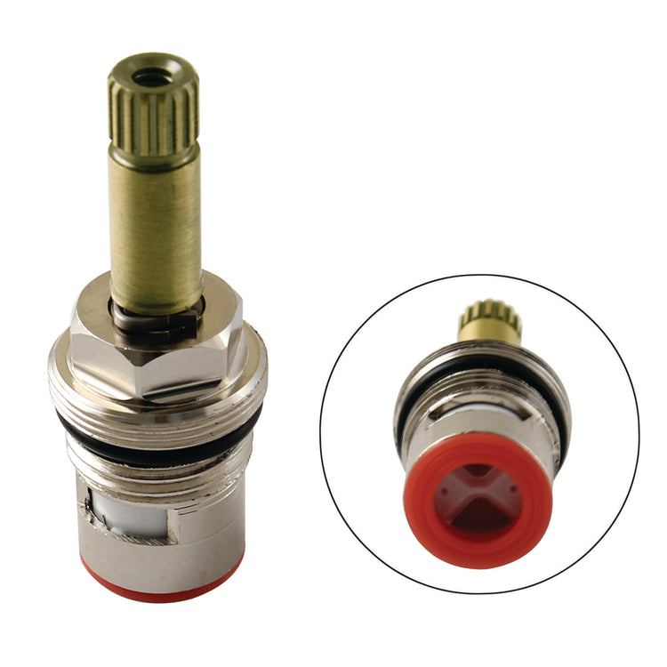 The ceramic disc cartridge is the heart of the faucet, controlling its temperature and water flow. Internally, two opposing discs made out of ceramic carbide rotate to control the flow of water. Because ceramic carbide is impervious to friction, it can last for many years before needing replacement. This hot-side stem cartridge with a 3/8" x 16 spline broach.