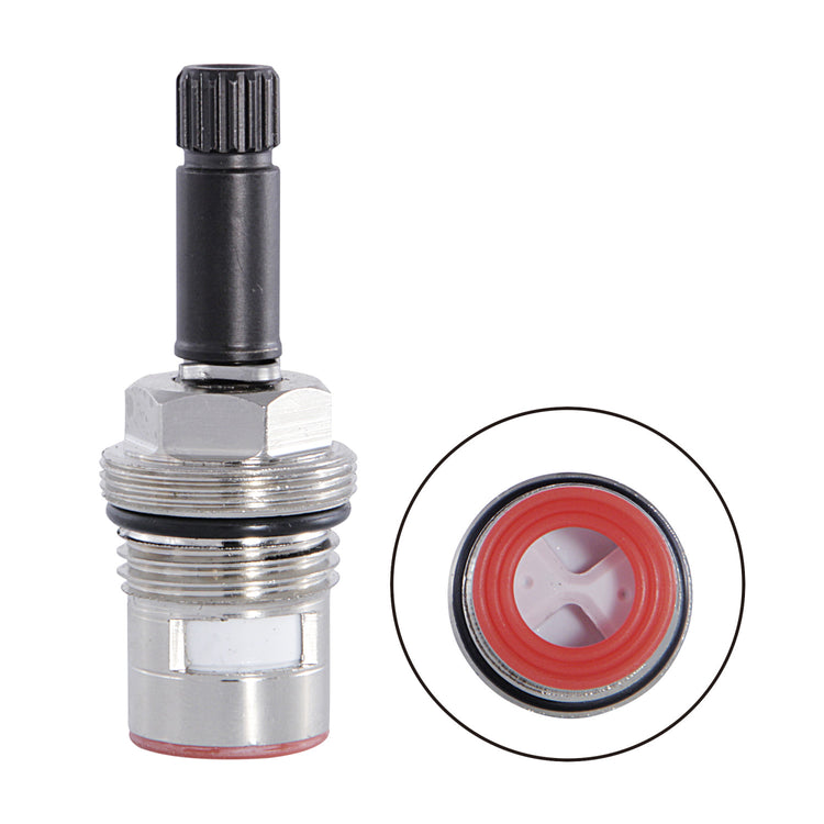 The ceramic disc cartridge is the heart of the faucet, controlling its temperature and water flow. Internally, two opposing discs made out of ceramic carbide rotate to control the flow of water. Because ceramic carbide is impervious to friction, it can last for many years before needing replacement. This hot-side stem cartridge with a 3/8" x 16 spline broach.