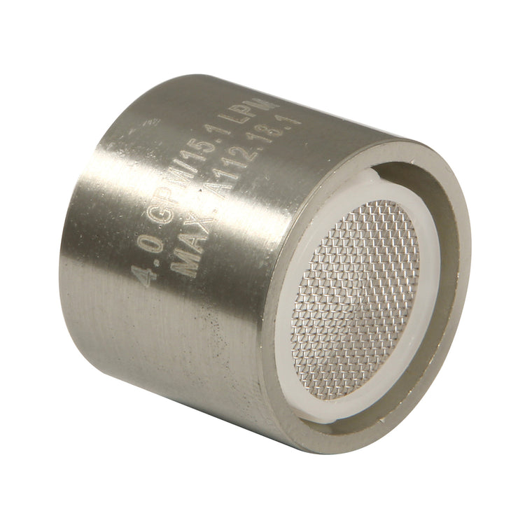 Installed at the ends of household faucets, aerators are designed with mesh screens to reduce splashing and dripping in sinks. A mixture of water and air is delivered while also helping to conserve water. This aerator's thread size: US female 55/64"-27 UNS connection. The water flow rate is 4.0 gallons per minute (GPM).