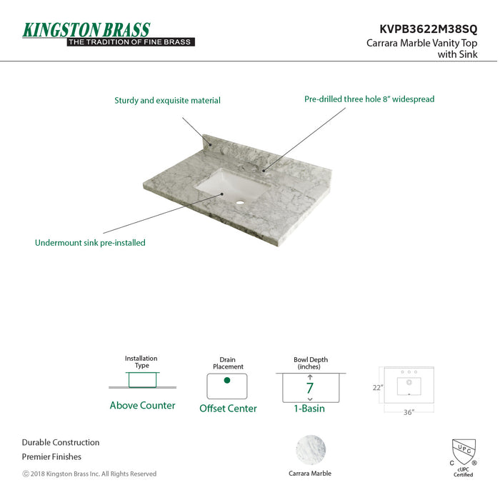Kingston Tulare KVPB3622M38SQ - Templeton 36-Inch Carrara Marble Vanity Sink Top (8" Faucet Drillings), Carrara Marble