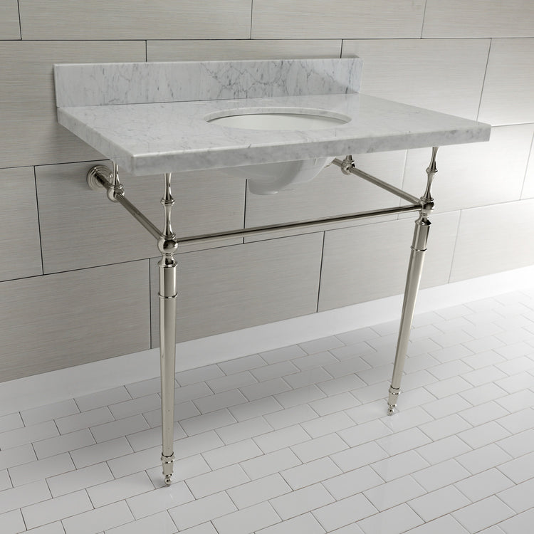 Kingston Heirloom KVPB3622M86 - Edwardian 36-Inch Carrara Marble Console Sink with Brass Legs (8-Inch, 3-Hole), Carrara Marble White/Polished Nickel