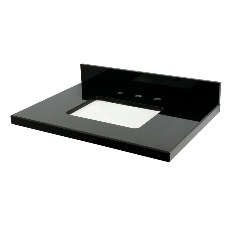 Fabricated from stunning Black Granite for long-lasting durability, the Templeton 30 in. x 22 in. Vanity Top offers elegant and transitional stylings. Heavy, durable, and beautiful, our Black Granite vanity tops will give your bathroom an exquisite, antique look. With different shades and natural veining, no two tops will be alike. Also for your convenience, a rectangular ceramic under mount sink is attached to this granite countertop. The pristine, stain-resistant surface and glistening finish make for a very sturdy fixture that is easily maintained. This vanity top comes with a built-in backsplash. Pair this top with console legs, available in a variety of finishes. Kingston's black granite tops are polished and sealed. Polished black granite has a shiny surface and resists stains. Natural stone, even when polished, and sealed is still somewhat porous and does remain susceptible to etching by acidic compounds like fruit juice, vinegar, some cleaning solvents, etc.