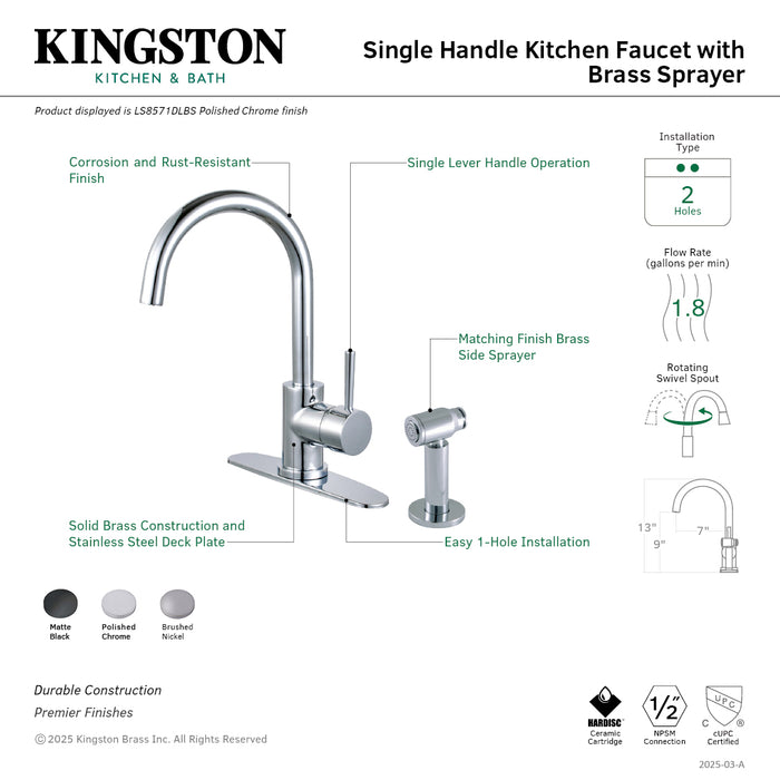 Kingston Sona LS8578DLBS - Concord Single-Handle 2-Hole Deck Mount Kitchen Faucet with Brass Side Sprayer, Brushed Nickel
