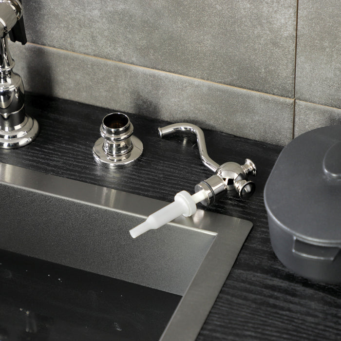 The Kingston Brass Vintage curved nozzle soap dispenser provides a cleaner look in the kitchen by allowing users to keep soap dispensers off the counter. Easily dispense soap with the push-down mechanism while adding a stylistic flair to your traditional home.