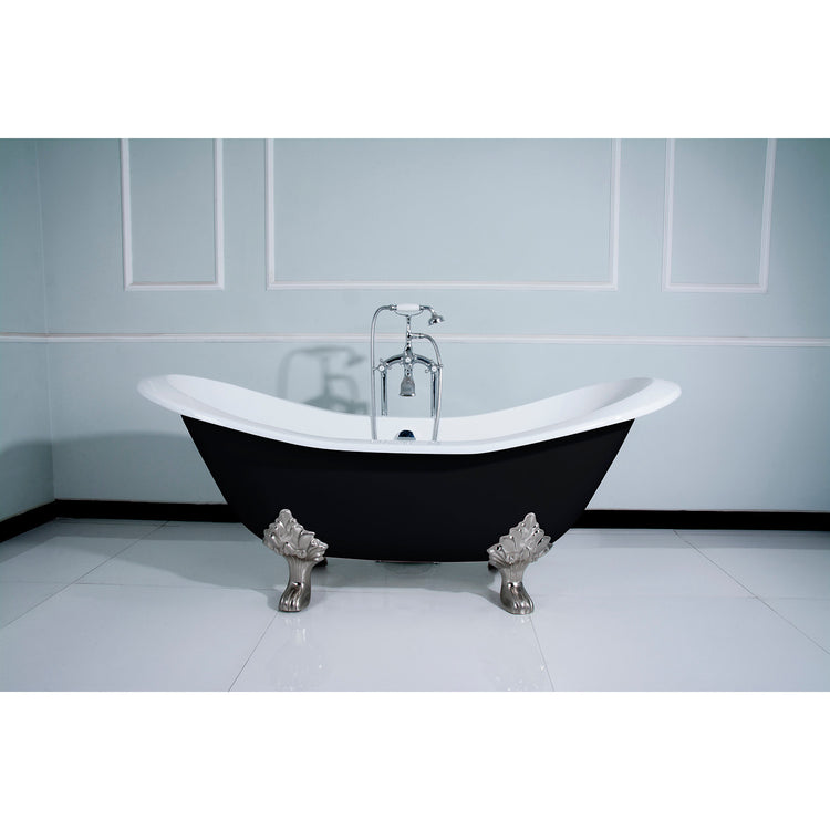 Surround yourself with the perfumed aroma of your favorite candle, grab your favorite piece of literature, and soak all of the stresses of the day away with the all-encompassing embrace of one of Kingston Brass' finest products, the clawfoot tub. Since the late 19th century, the claw foot tub has stood prominent among bathroom fixtures for its outstanding grandeur. The Aqua Eden black 72" cast iron double slipper clawfoot tub (no faucet drillings) will wholly beautify your home for years to come thanks to its durable and heavy cast iron construction. Elegantly crafted clawfoot tub feet are included to further elevate your home's traditional eminence. This bathtub features a striking and bold matte black exterior, a classic, durable, easy to clean glossy white enameled interior and rim, and of course finish matched feet.