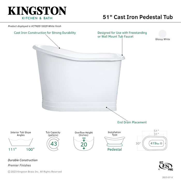 Kingston Heirloom VCTND513029 - Aqua Eden 51-Inch Cast Iron D-Shaped Single Slipper Pedestal Tub (No Faucet Drillings), White