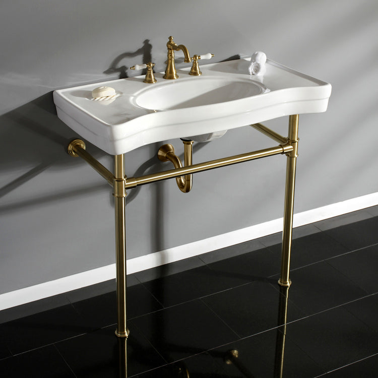Imperial VPB1367ST 36-Inch Ceramic Console Sink with Stainless Steel Legs (8-Inch, 3-Hole), White/Brushed Brass