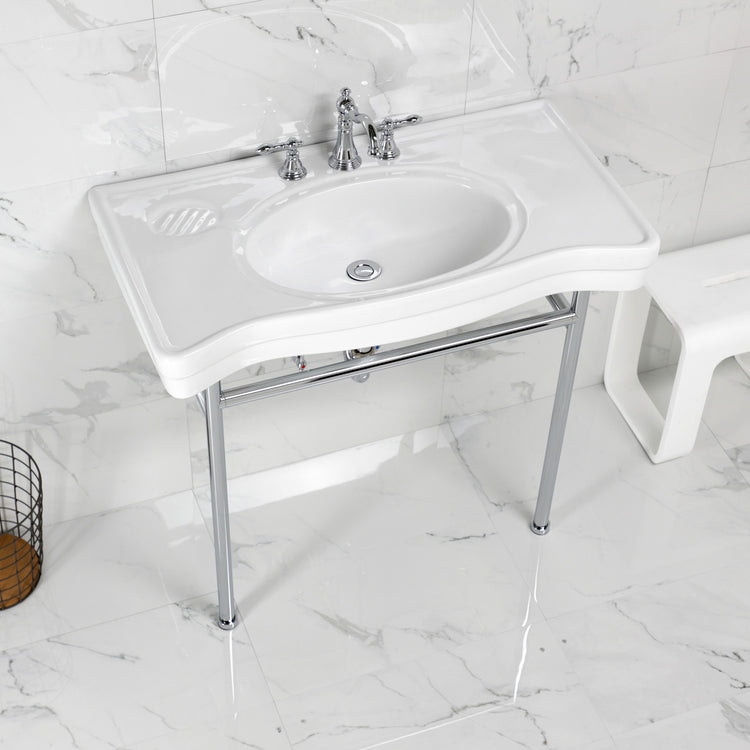 With a beautiful ceramic counter top, this console sink set is a long lasting, durable, and elegant addition to your bathroom. A fabulous alternative where space is limited or tight, making them friendly for the whole family. The pristine, stain-resistant surface and glistening finish make for a very sturdy fixture that is easily maintained. Also for your convenience, anti-slip rubber pads are included with the stainless steel legs to ensure steadiness. Water supply kit, drain assembly, and the faucet are sold separately.
