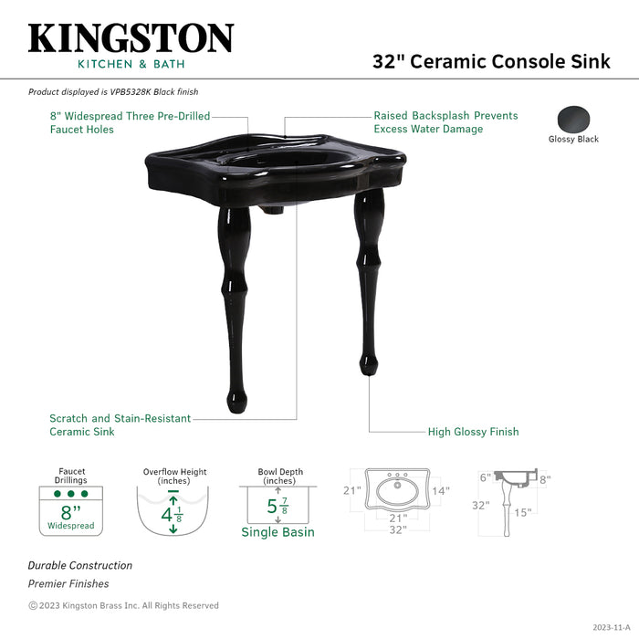 Kingston Heirloom VPB5328K - Imperial 32-Inch Ceramic Console Sink with Ceramic Legs (8-Inch, 3-Hole), Black