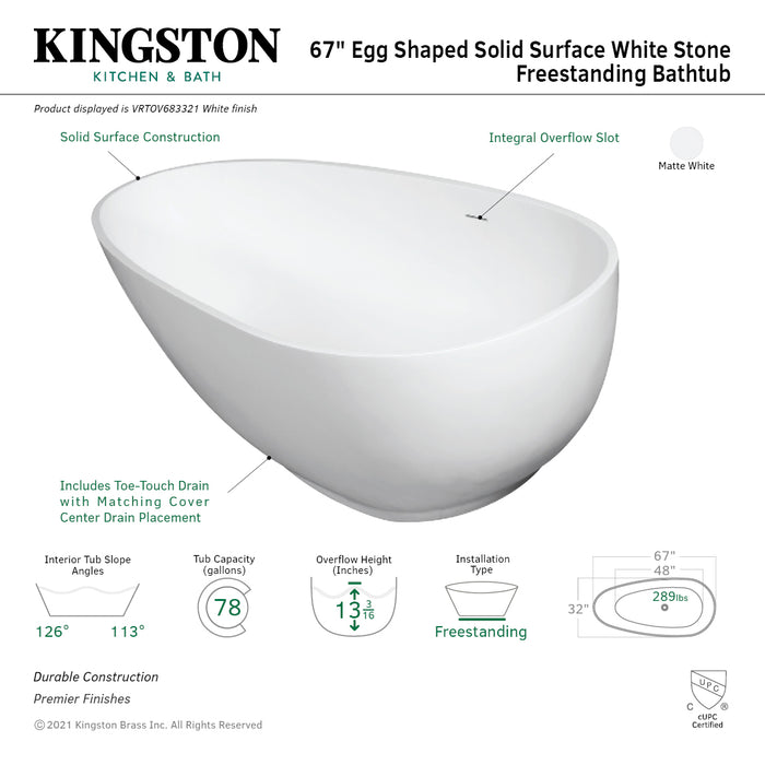 Kingston Sona VRTOV683321 - Arcticstone 67-Inch Solid Surface Egg Shaped Double Ended Freestanding Tub with Drain, Glossy White/Matte White