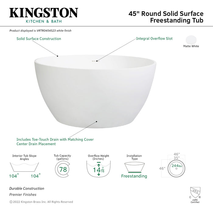 Kingston Sona VRTRO454523 - Arcticstone 45-Inch Solid Surface Round Double Ended Freestanding Tub with Drain, Matte White