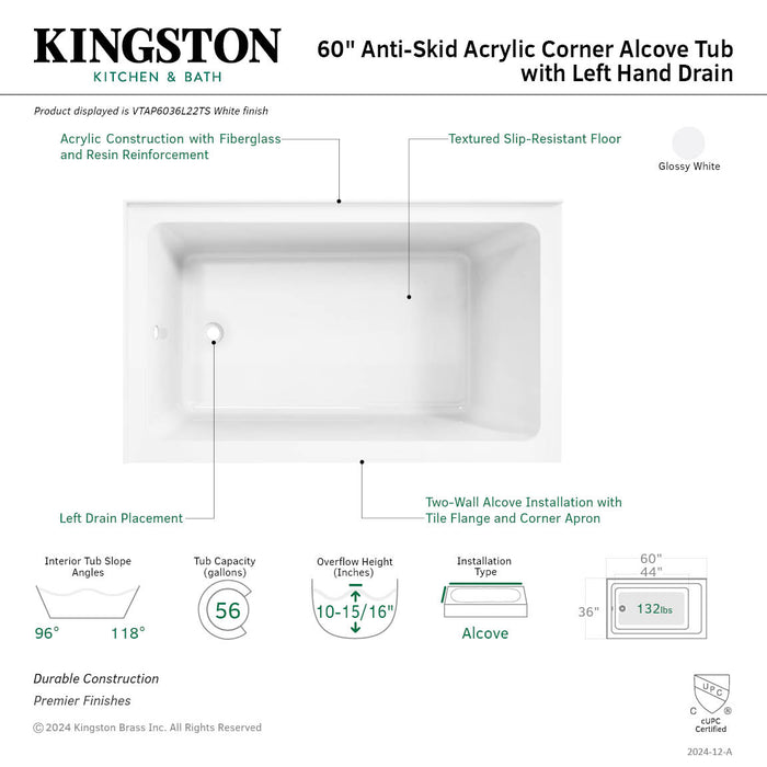 Kingston Tulare VTAP6036L22TS - Aqua Eden 60-Inch Acrylic Rectangular 2-Wall Corner Alcove Tub, Left Hand Drain, Glossy White